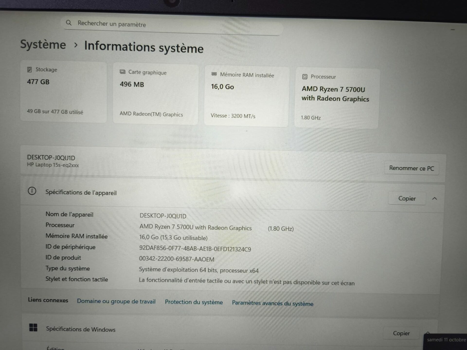 Processeur : AMD Ryzen 7 5700U, 8 cœurs, 1.8 à 4,3 GHz – performant pour multitâche avancé, développement, et retouches photo occasionnelles.