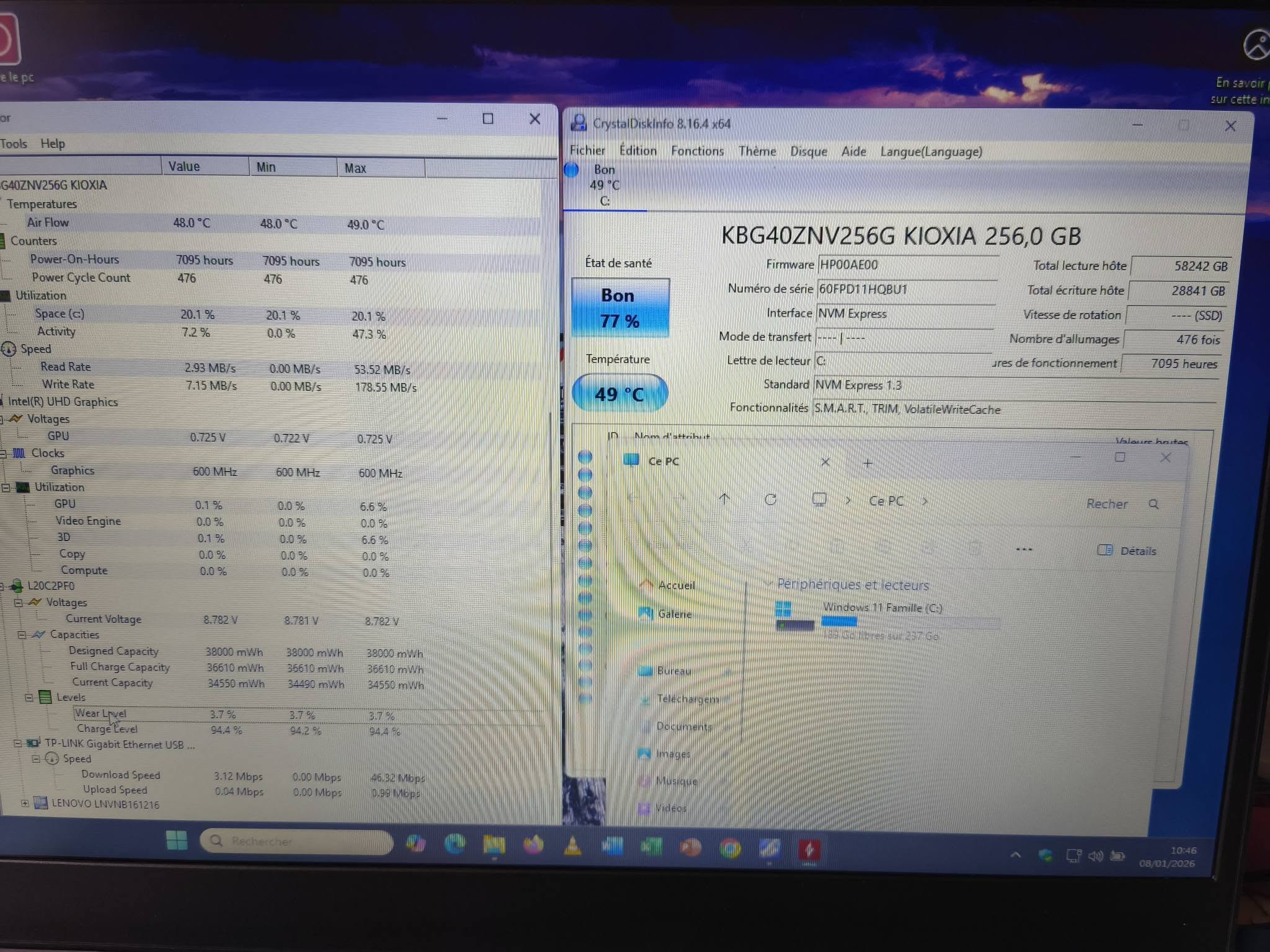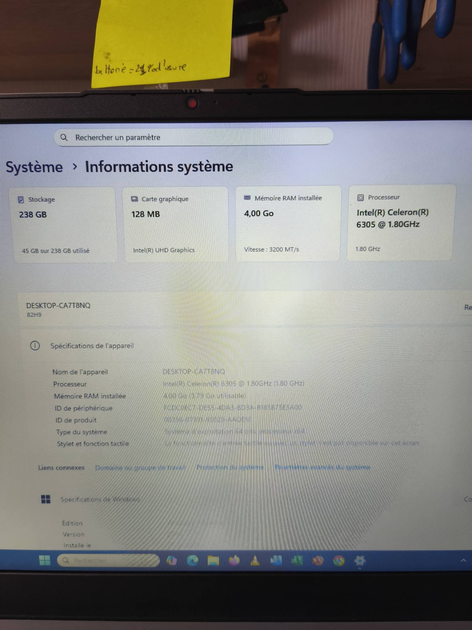 Stockage : 256 Go SSD NVMe (rapide) + 500 go dd (sauvegardes)